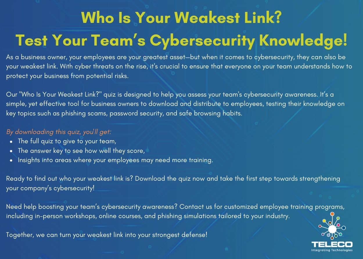 Cyber threats don’t just target large enterprises—they affect organizations of every size, including local businesses right here in our community. At Teleco, we believe prevention starts with awareness, and with the right tools in hand, you can dramatically reduce your risks.